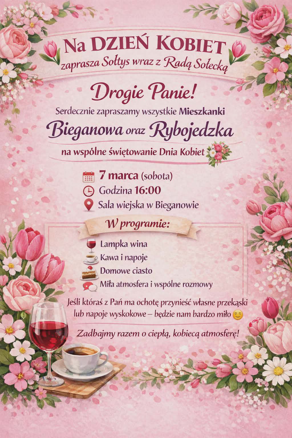 Zaproszenie na spotkanie z okazji Dnia Kobiet. Szczegóły na plakacie. >>>kliknij<<<